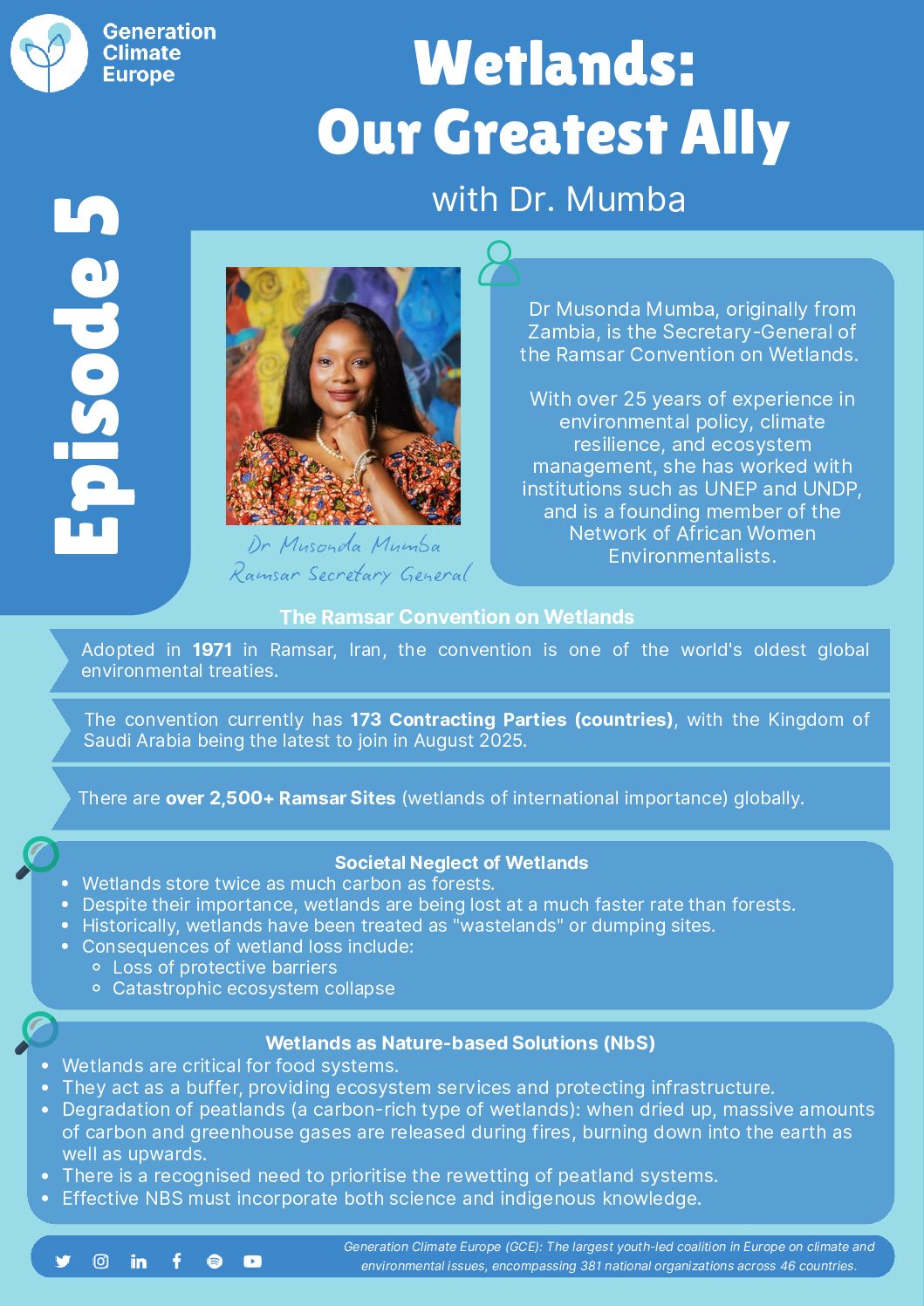 Episode 5 explores the vital role wetlands and peatlands play in global carbon storage, how they have been historically perceived, and what implications this has for our ecosystems, food systems, and infrastructure. Meet Dr Musonda Mumba, originally from Zambia and the Secretary-General of the Ramsar Convention on Wetlands. She shares her expertise from over 25 years of experience in environmental policy, climate resilience, and ecosystem management. Dr. Mumba founded the Network of African Women Environmentalists and has collaborated with institutions such as UNEP and UNDP.